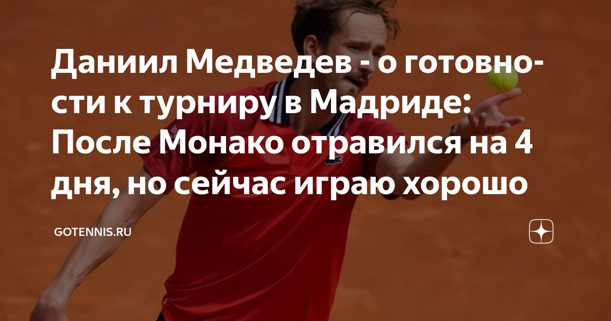 — Чувствую себя хорошо. К сожалению, после турнира в Монако я отравился или подхватил какой-то вирус, из-за чего пропустил четыре или пять дней тренировок, хотя планировал сразу же начать подготовку к грунтовому сезону. Но сейчас я ощущаю, что играю хорошо, посмотрим, как это проявится на корте.