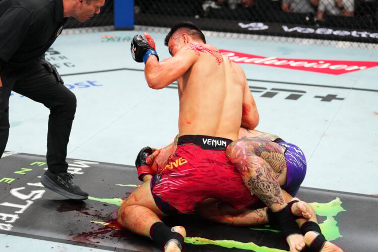 Пока медицинский персонал обрабатывал сильное рассечение на голове Смита, из которого кровь заливала лицо, боец выглядел явно разгневанным и показал двойной средний палец кому-то возле клетки. Смит неоднократно показывал этому человеку неприличный жест и в конце концов поднялся с канваса к решетке, где продолжил кричать на него.