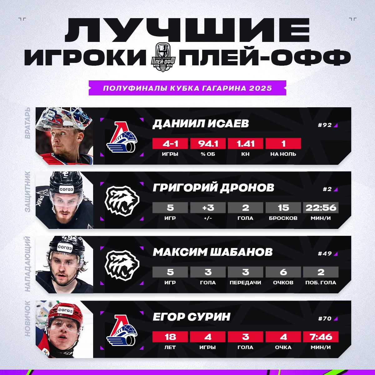 Комиссия Континентальной Хоккейной Лиги по определению лучших игроков, основываясь на статистических данных Центрального информационного бюро и анализе матчей, определила лауреатов третьего раунда плей-офф в четырех категориях.