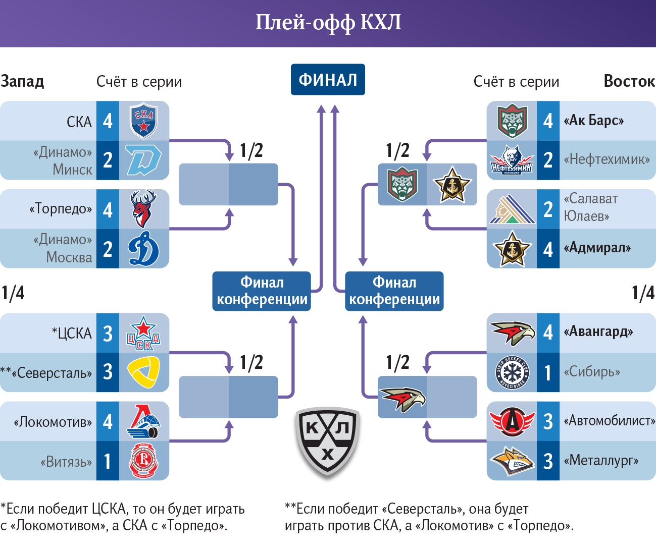 Из восьми команд Восточной конференции, которые уже обеспечили себе место в плей-офф, только челябинский «Трактор», лидер Востока, может быть уверен в своей позиции. В первом раунде «Трактор» встретится либо с «Сибирью», либо с «Адмиралом», которые ведут борьбу за седьмое место. «Адмирал» на данный момент опережает «Сибирь» на одно очко, имея при этом матч в запасе, что делает их фаворитами в борьбе за седьмую строчку.