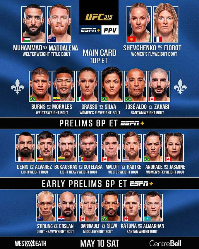 Церемония взвешивания UFC 315 запланирована на 17:00 вечера по Восточному времени (ET).